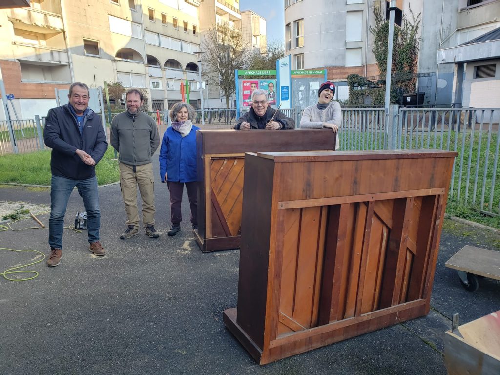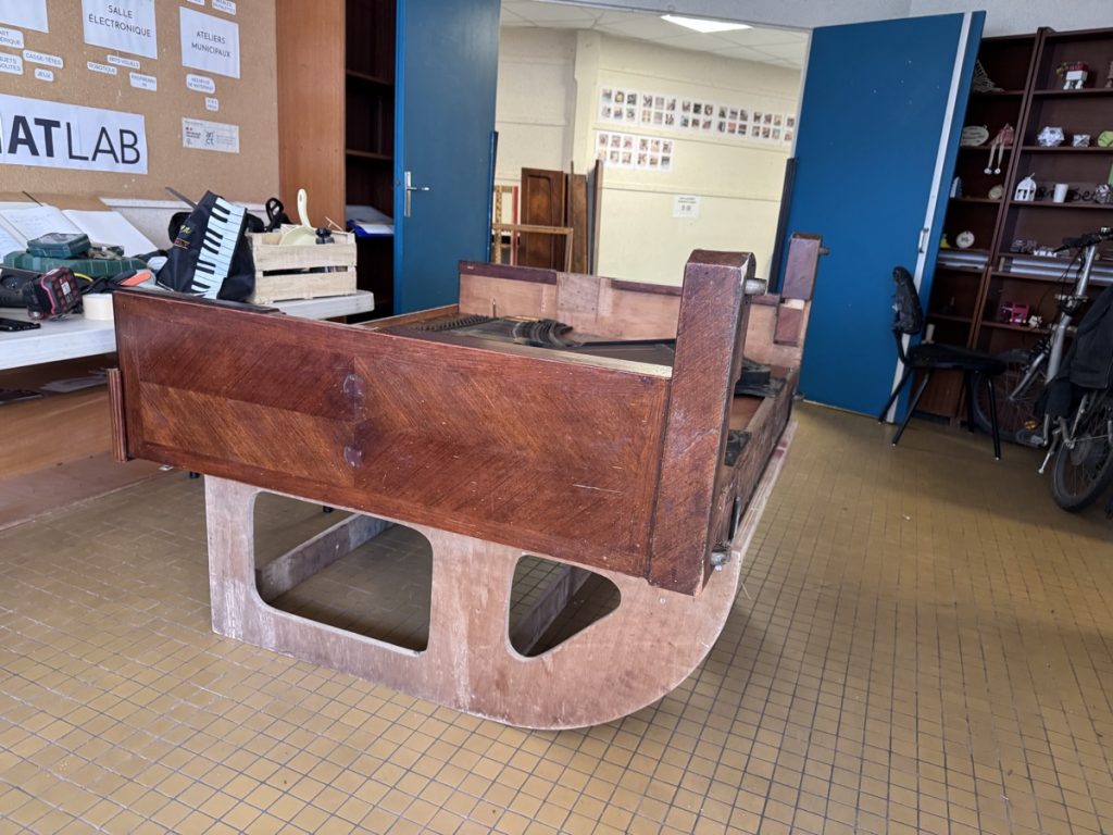 Ces deux jours se sont révélés concluants ! Le bois a été redistribué à l’Atelier chantier d’insertion « Le Bois de Deux Mains » à Soissons afin qu’il soit réutilisé dans la fabrication de mobilier. La ferraille (cadre en fonte, cordes acier) a été revendue à des ferrailleurs.