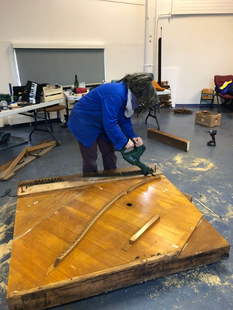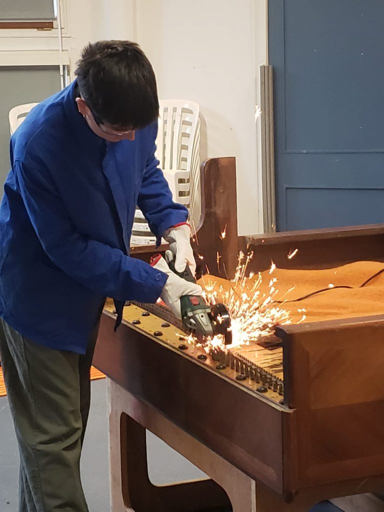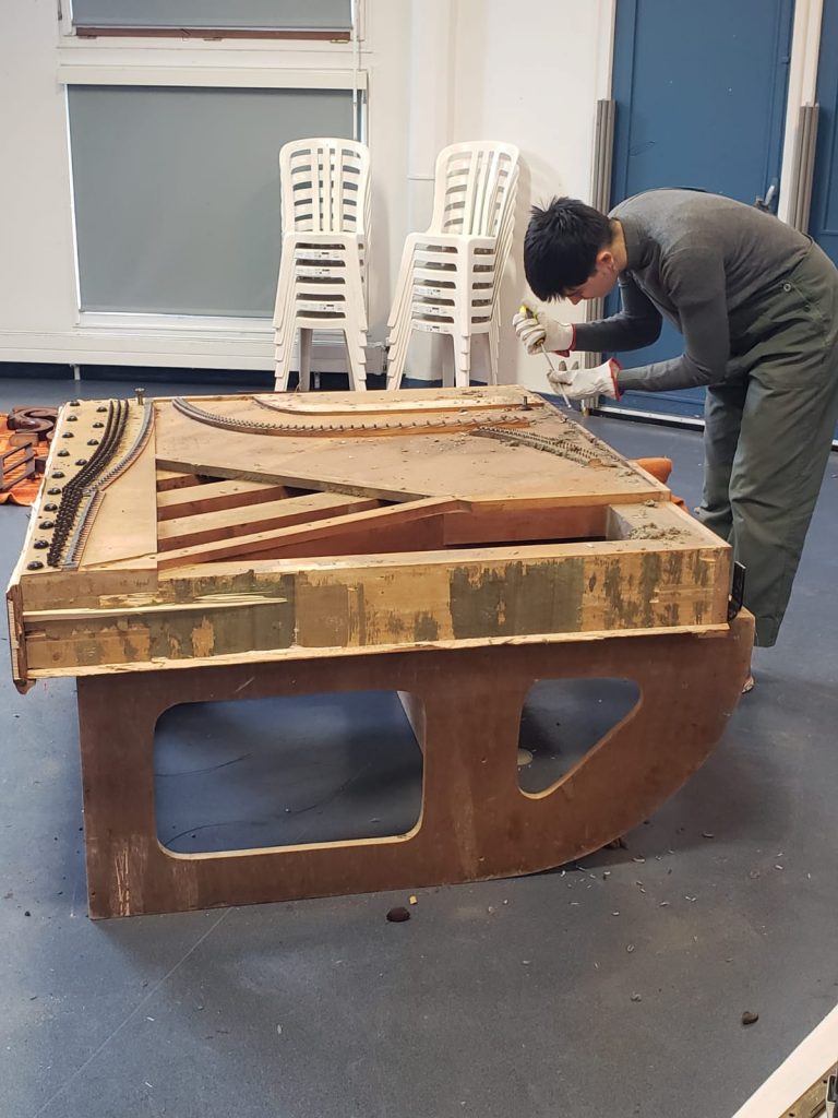 Afin d’analyser la procédure de démontage et d’optimiser ces démantèlements, Gaëlle Pavie, à l’initiative du projet, s’est faite aidée par Océane Charlier, technicienne pianos formée en récupération et démantèlement de pianos de rebut (entreprise Pianos Recycled, Australie). D’autres personnes sont également venues prêter main forte au duo 🙂